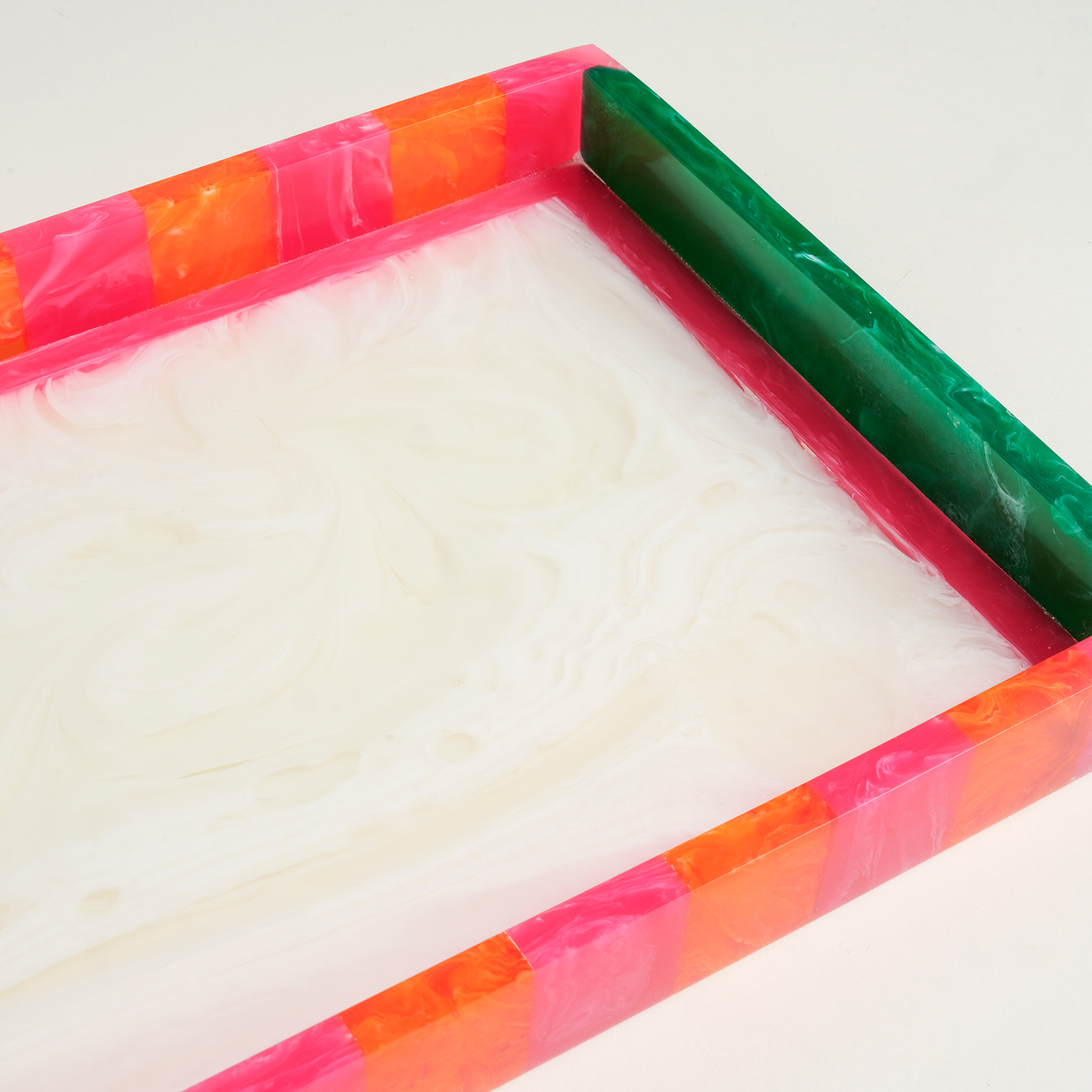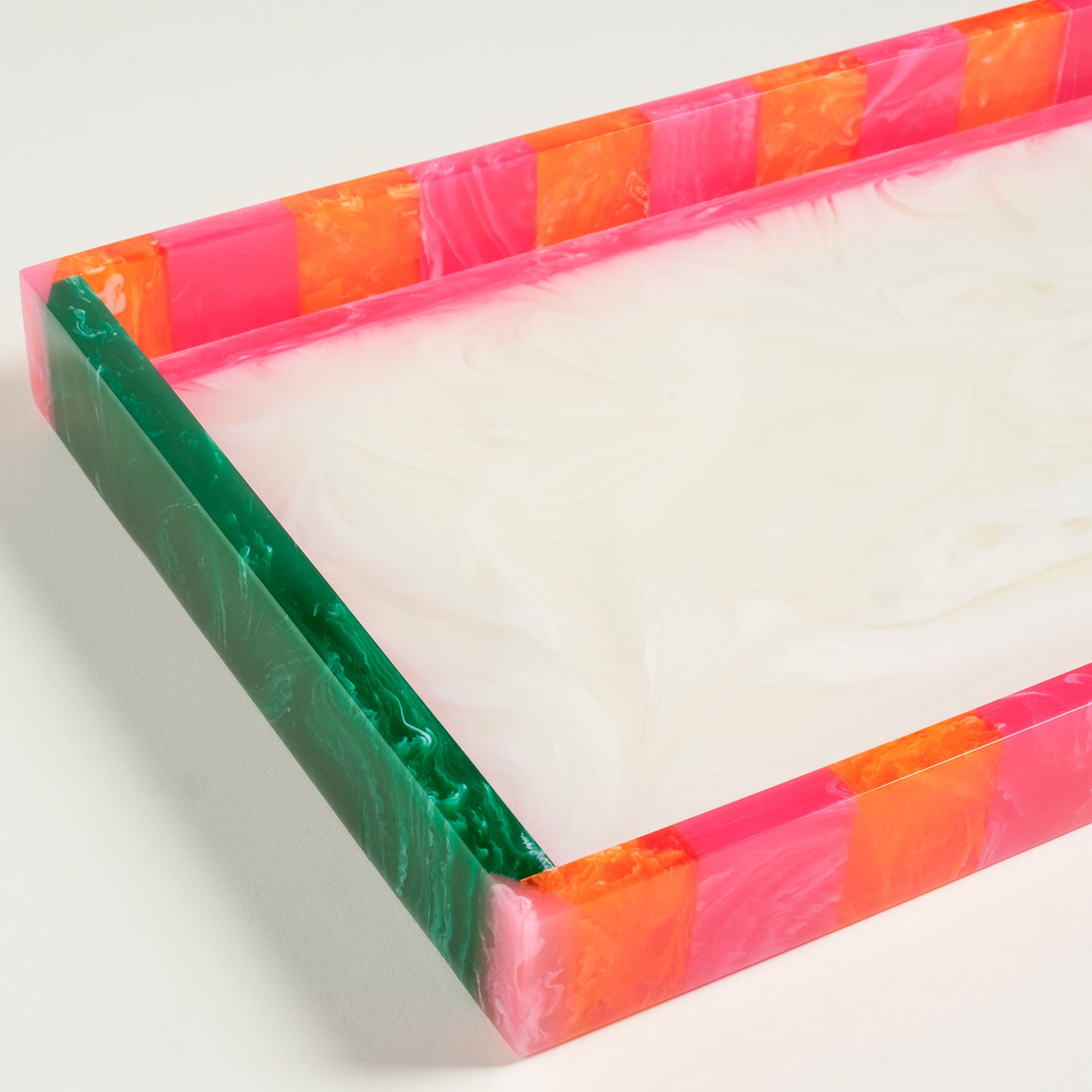 Cheerland koleksiyonunun kutlama ruhu, Tanda Reçine Dikdörtgen Tepsi’de davetkâr ve neşe dolu bir şölene dönüşüyor. Renkli bordürleri ve parlak zemininin yarattığı kontrast, modern ve oyuncu bir his uyandırıyor. Hindistan’da özenle üretilen bu parça, sunumlarda kullanılabildiği gibi dekoratif bir obje olarak da evin her köşesinde neşe saçıyor.