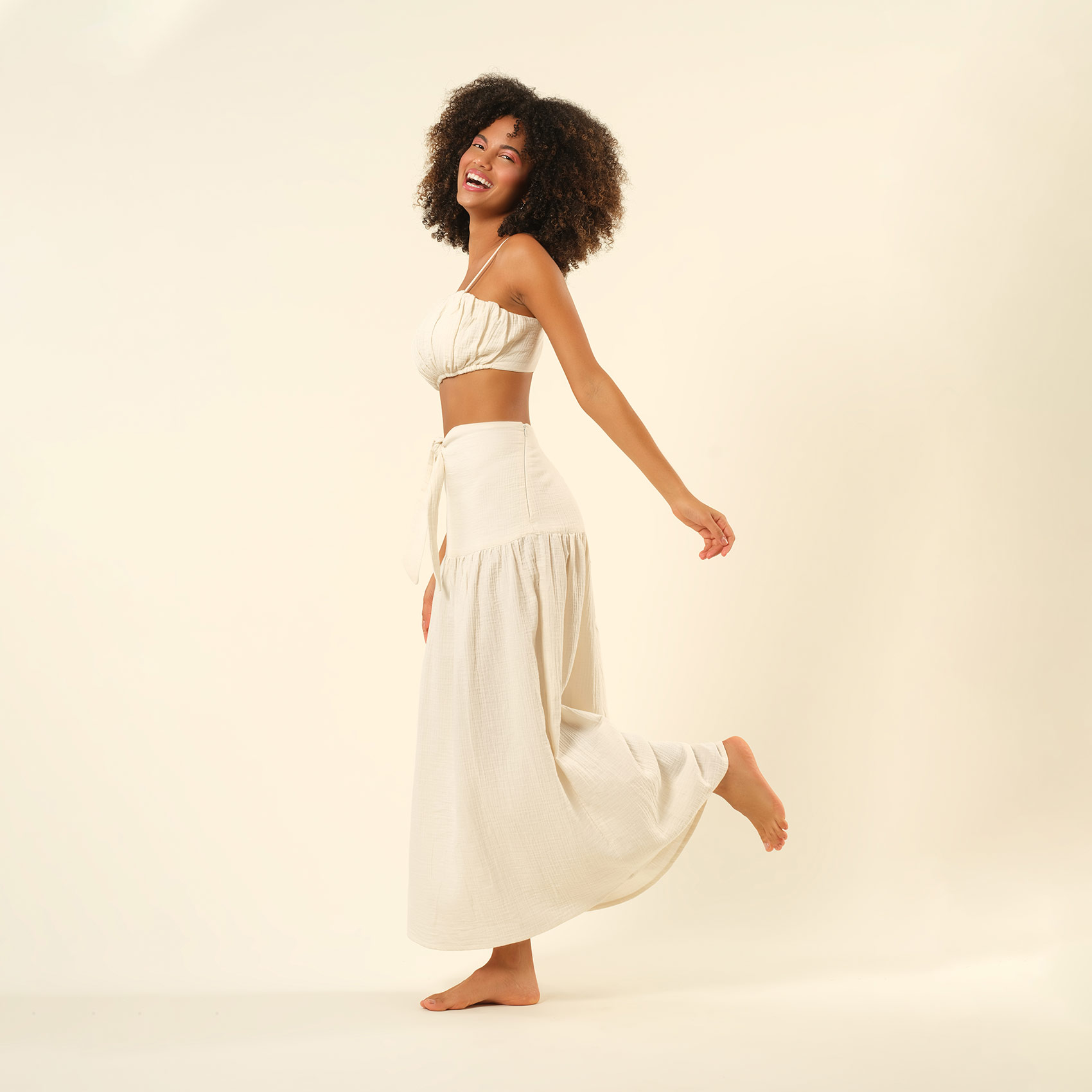 Hafif, havalı ve yazın vazgeçilmezi! Yumuşacık pamuk dokusu, nefes alabilen yapısı ve eğlenceli pileli kesimiyle bu askılı büstiyer, stilinize özgür bir dokunuş katıyor. İnce askıları zarif bir görünüm sunarken, soft ekru tonu her kombine kolayca uyum sağlıyor. Plajda keten şortlarla, şehirde yüksek belli pantolonlarla tamamlayın. Gün sizi nereye götürürse götürsün, Tavas askılı %100 pamuk büstiyer stilinizi özgürce yansıtacak!