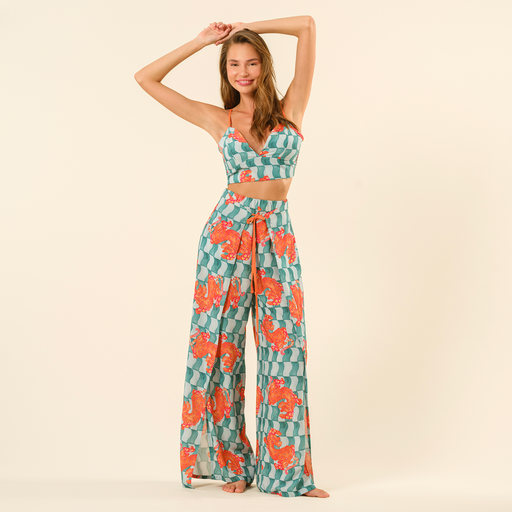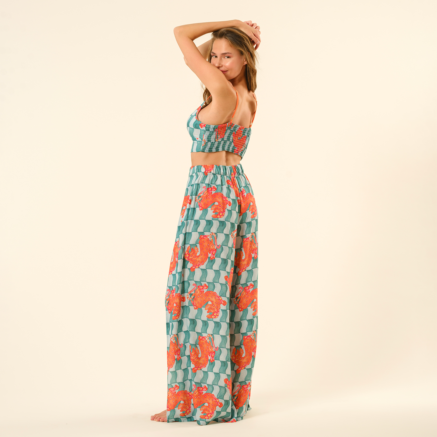 Tavas dijital baskılı ince askılı %100 viskon bluz, güneşin altında özgürlüğü ve şıklığı hissetmeniz için tasarlandı. Hafif ve nefes alan viskon dokusu, cesur maksimalist desenleri ve rahat kesimiyle yaz stiliniz şimdi çok daha eğlenceli. Egzotik kaplan motifleri ve tropik esintilerle dolu bu tasarım, plajdan şehre her ortamda kendinizi ifade etmenin en iddialı yolu. Bikini üstü olarak kullanabilir, yüksek bel pantolonlarla kombinleyebilir veya bir gömlekle tamamlayabilirsiniz. Nasıl kombinlerseniz kombinleyin, bu bluz maceraya hazır.