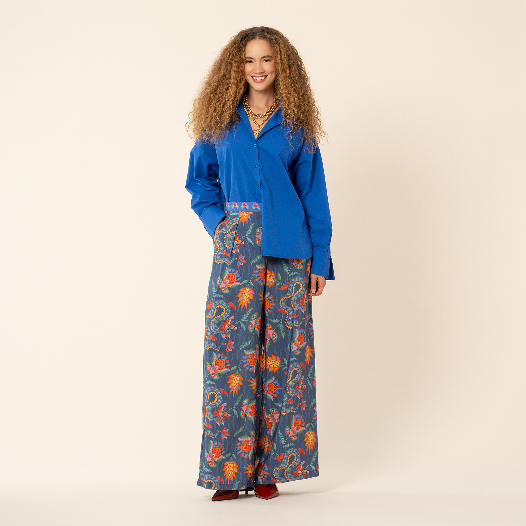 Tavas pantolon, Maximalist dünyanın enerjisini her adımınıza taşıyor. Lacivert zeminde parlayan tropik desenler, sıradanlığa karşı renkli bir ifade yaratıyor. Rahat formu özgürlük sunarken desenlerin coşkusu ruhu canlandırıyor. Giyin ve stilinizi ateşleyin, çünkü hayatın her anı parlamayı hak ediyor.
