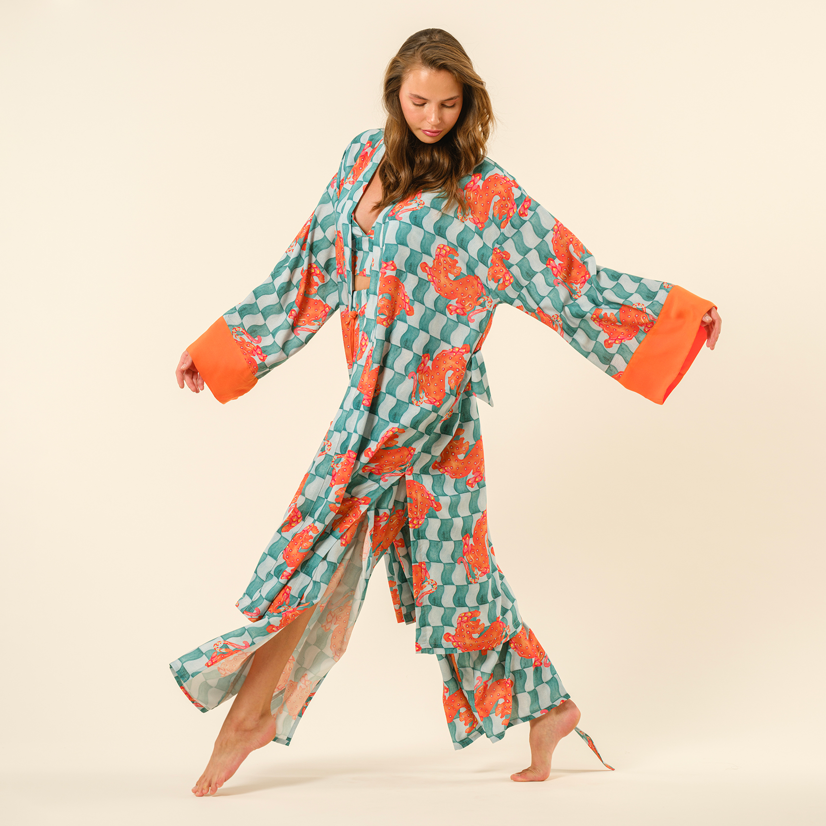 Tavas pantolonla özgürlüğün ritmini yakalayın! Hafif ve akışkan %100 viskon dokusuyla tasarlanan geniş paçalı kesimi, doğadan ilham alan canlı yeşil tonu ve oyuncu kaplan desenleriyle buluşuyor. Her adımda canlanan bu pantolon, ister plajda ister şehirde ruhunu özgür bırakmak isteyenler için tasarlandı. Bikini üstüyle sahil şıklığına, gömlekle sofistike bir dokunuşa, takım parçalarla baştan aşağı uyuma hazır; siz nasıl hissediyorsanız, Tavas pantolon da öyle hissediyor!