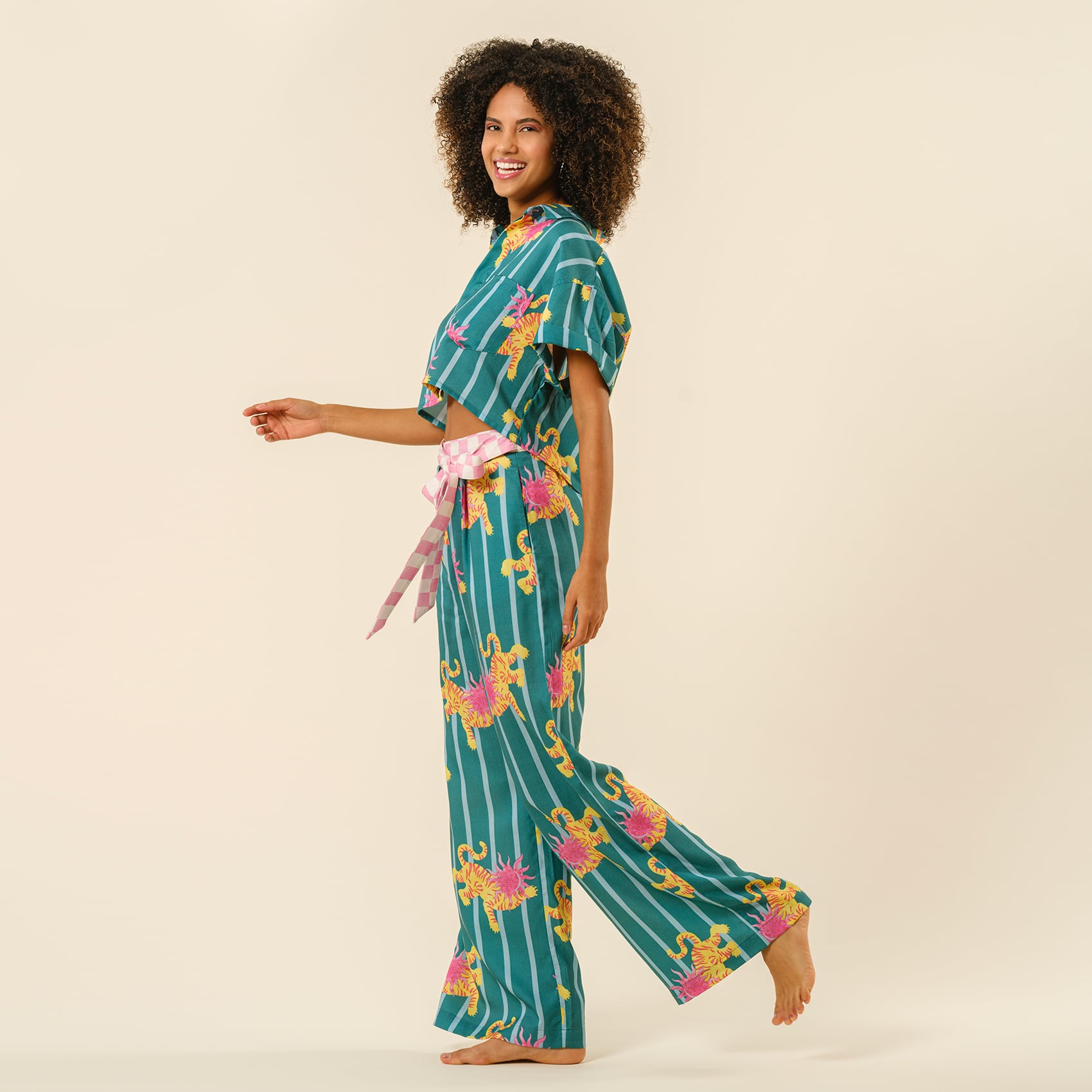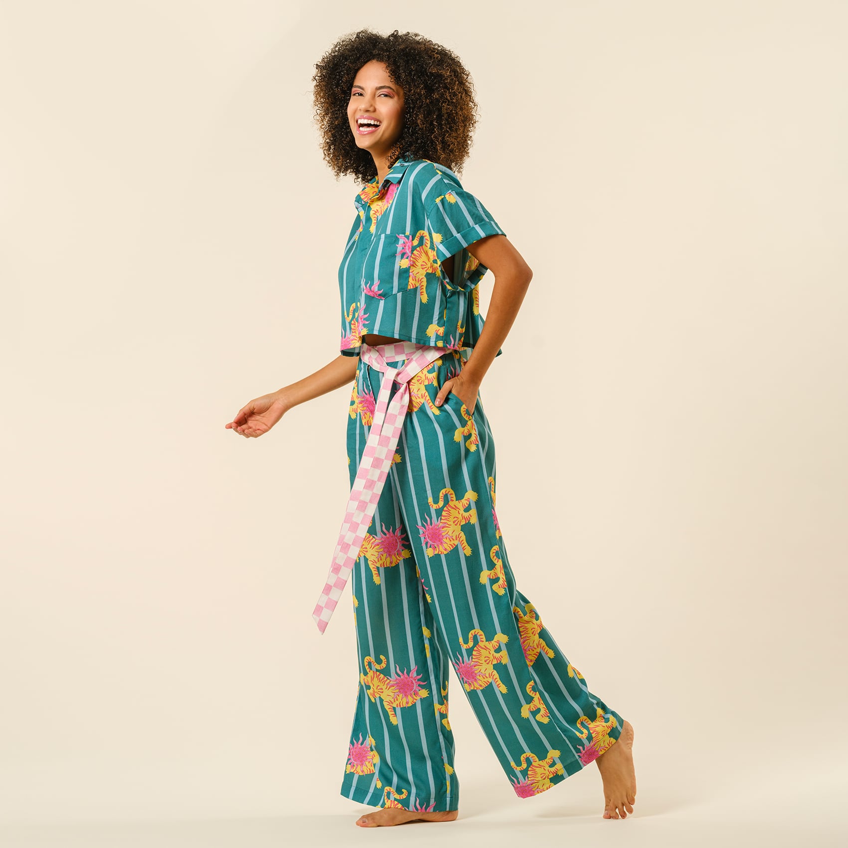 Tavas pantolon, zahmetsiz şıklık ve özgüvenli bir duruş! Yumuşak ve akışkan %100 Tencel dokusuyla gün boyu ferahlık sağlarken, enerjik kaplan desenleri ve dinamik çizgileriyle göz alıcı bir stil sunuyor. Rahat kesimi ve beli saran bağcık detayıyla ister şehirde ister sahilde, giyin ve çıkın, özgürlüğün tadını çıkarın! Sandaletle rahat ve stil sahibi, topukluyla doğal bir zarafet. Tarzınızı nasıl yorumlayacağınız tamamen size kalmış!