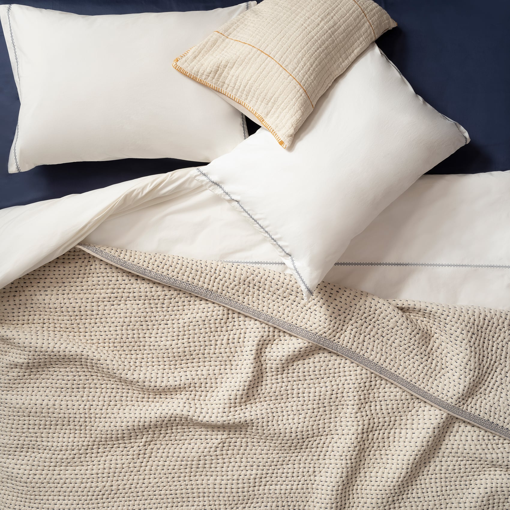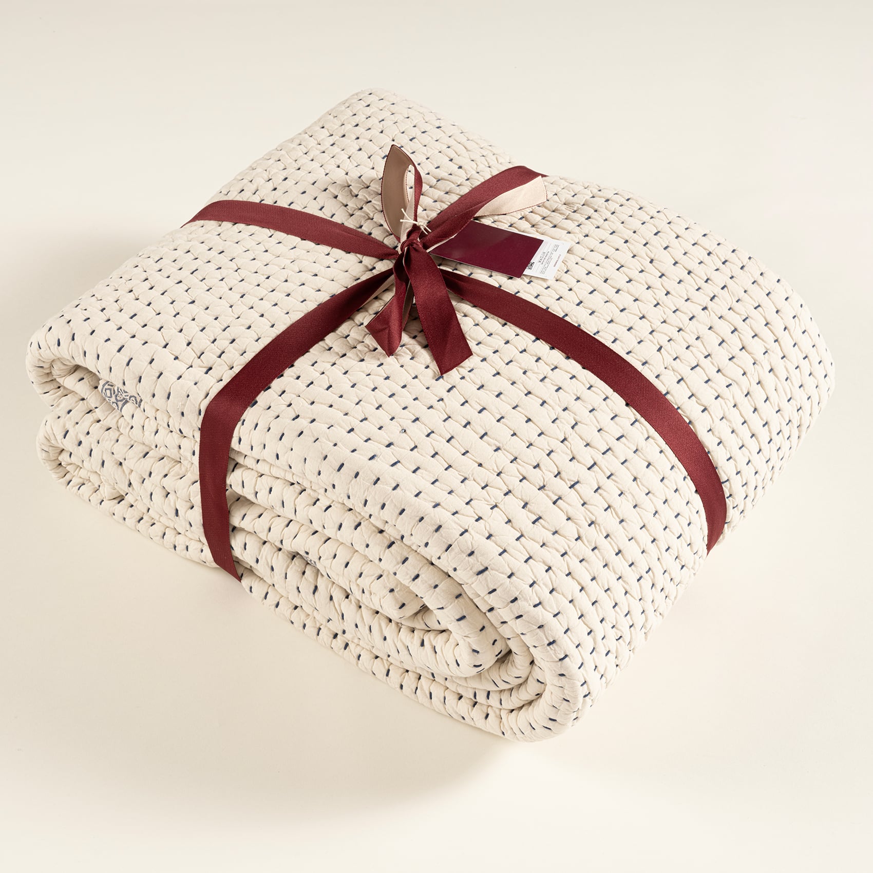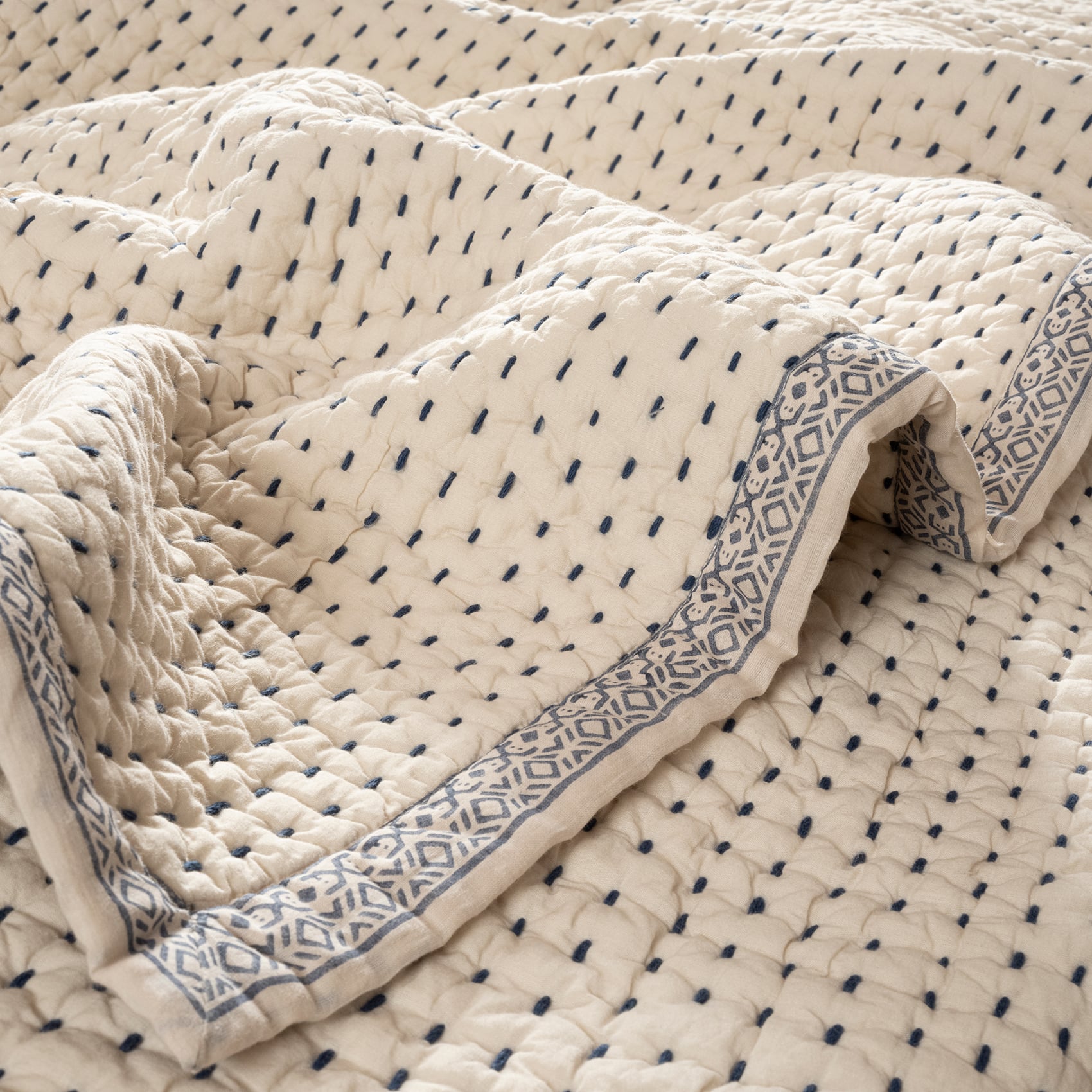 Hindistan’daki zanaatkâr atölyelerinde hayat bulan bu yatak örtüsü en ince ayrıntısına kadar el işçiliğinin izini taşıyor. Örtüyü çerçeveleyen etnik desenler geleneksel Hint ahşap baskı tekniğiyle yatak örtüsüne dahil ediliyor. El işi dikişlerle tamamlanan tasarım, %100 doğal dokuma pamuktan elde edilen kumaşı sayesinde uzun yıllar boyunca kullanılabiliyor. Çamaşır makinesinde yıkayabilirsiniz.